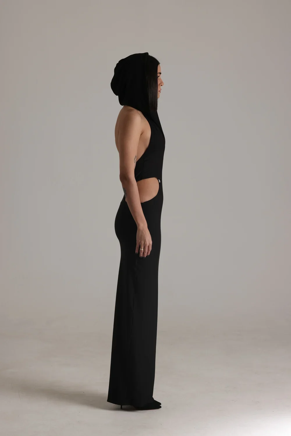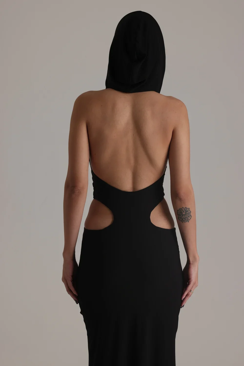 Elevate your wardrobe with this shaping cut-out dress, crafted from a luxuriously jersey soft fabric and finished with a stylish hoodie for a modern, athletic edge.